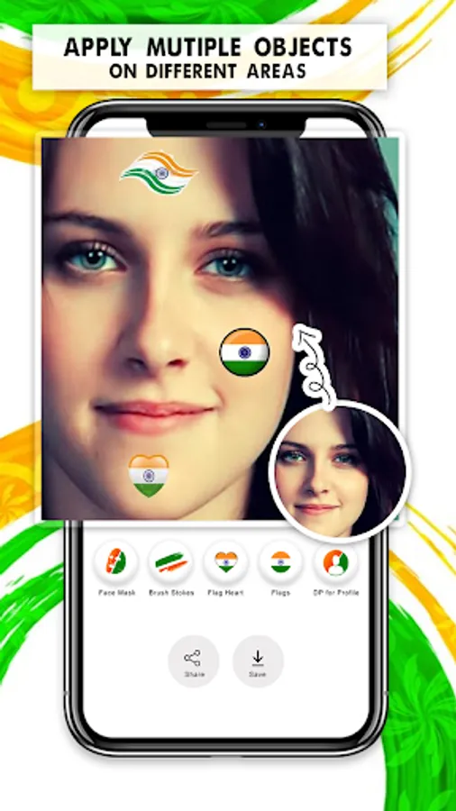 India Flag Face Sticker Photo Maker is a India photo maker app having Ind flag face stickers for pics designed to make your India photo selfie or other pics of 15 august India flag just awesome. Give the 15 August Wishes to the country by making feel proud to have India flag images on your 15 august pics. You can put ind flag on flex, banner or 15 august profile pic dp as well.