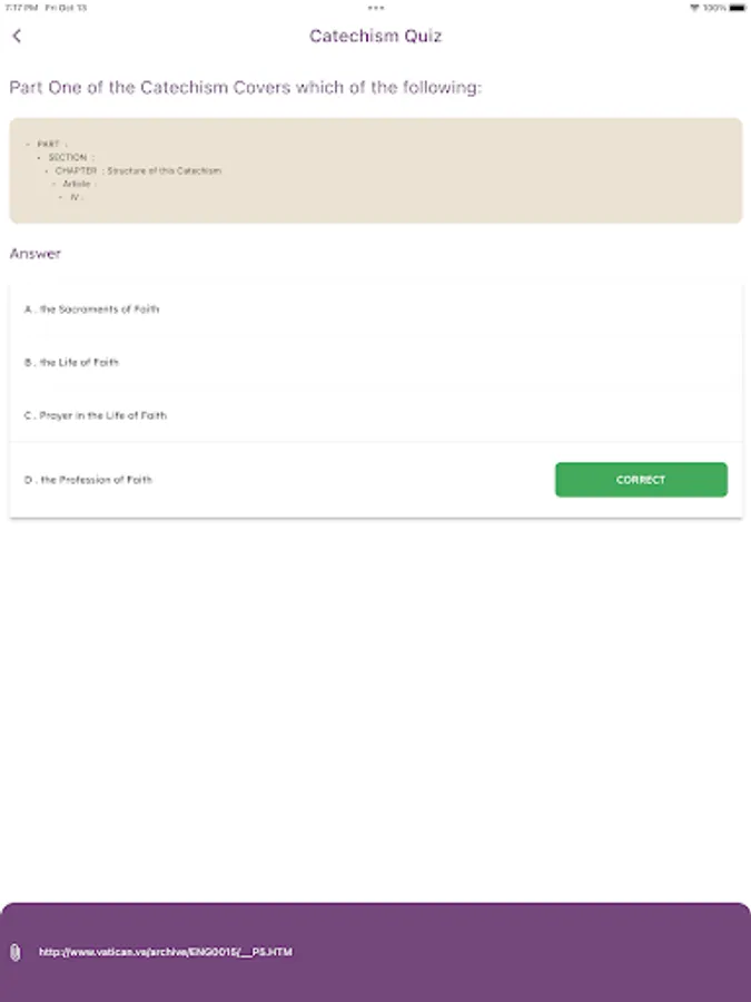 With an intuitive design, the Catechism Quiz boasts a user-friendly interface that’s both visually appealing and easy to navigate. Its sleek, minimalistic aesthetic draws inspiration from the sacred art and architecture of the Church, using a palette of liturgical colors. Every section, button, and quiz is optimized for smooth functionality, ensuring an uninterrupted experience.