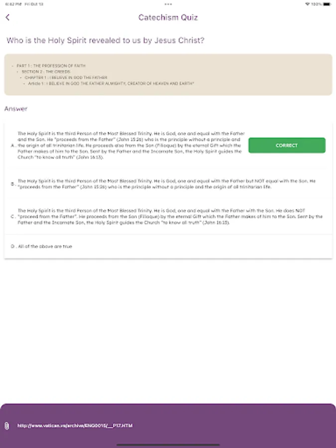Introducing the Catechism Quiz app, an innovative mobile application specially designed for all listeners of the "Catechism in a Year" podcast. This app provides an immersive experience, allowing users to test and reinforce their understanding of the Catechism of the Catholic Church in a fun and engaging manner. Whether you've just started your journey or you've completed the entire podcast series, the Catechism Quiz offers challenges suited to every level of mastery.