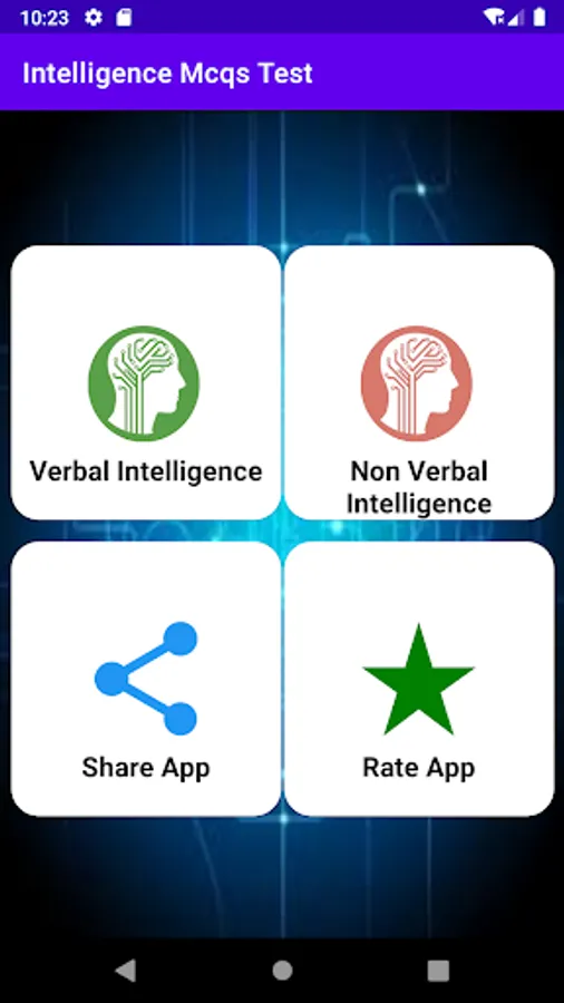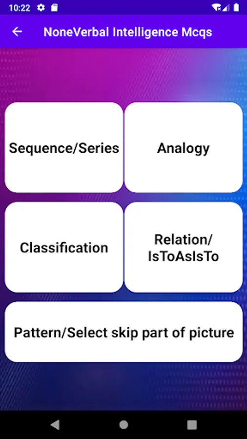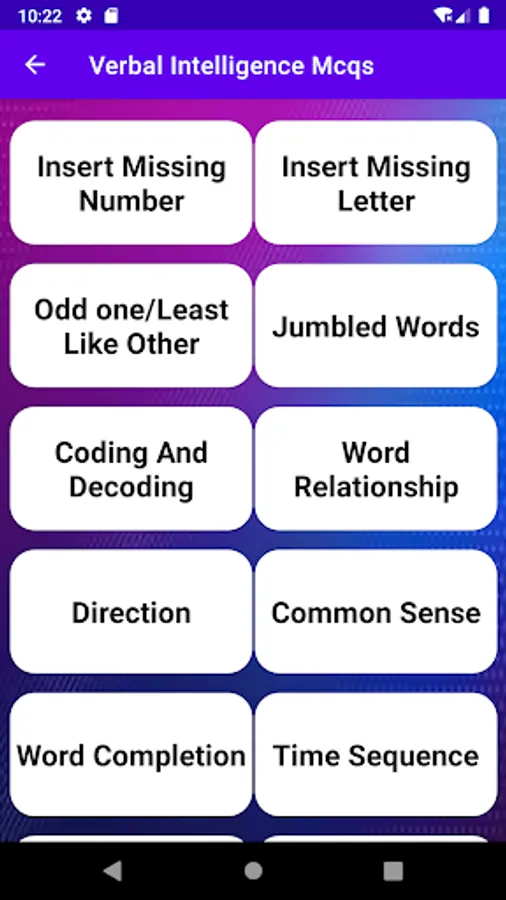 Intelligence Mcqs Test is an app in which Verbal and Nonverbal Important Solved Intelligence mcqs with category wise Contain.