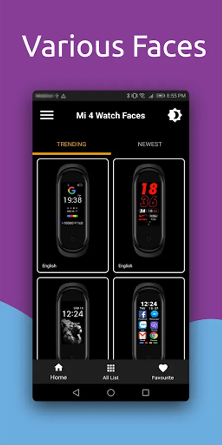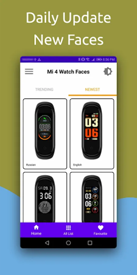 1) Home layout of the app has 3 tabs: NEW, TREND, FAVOURITE displays the NEW images mi band 4; TREND displays the images mi band 4 which many people views; FAVOURITE displays the images mi band 4 watchfaces which you like.