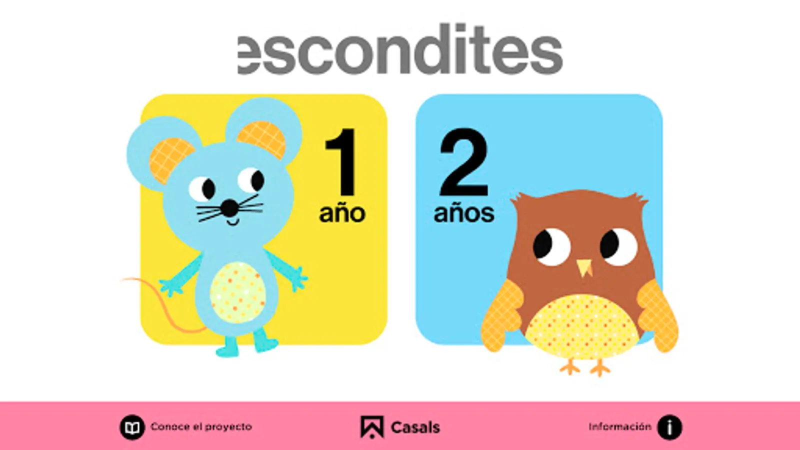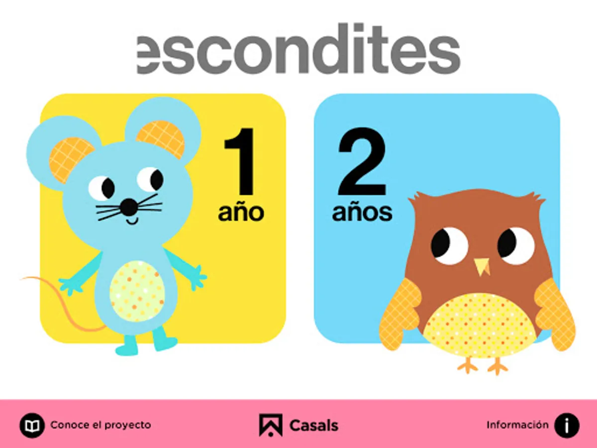 At your disposal all the digital content of the Escondites first cycle Early Childhood Education project by Editorial Casals. A material that bases the origin of any knowledge acquired on the innate curiosity of children, and places them as protagonists of their own learning. Through a globalized Montessorian-inspired method we offer you interactive games, video stories, songs and bits. In addition, many of the proposals are also available in English.