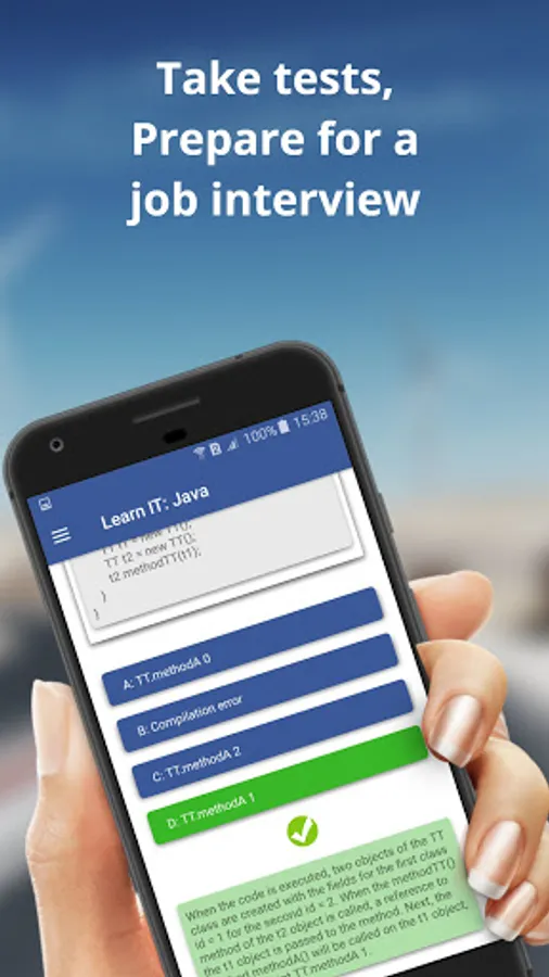 - improve your skils by passing tests. In tests you will find detailed explanation of answers which will help you to grow.