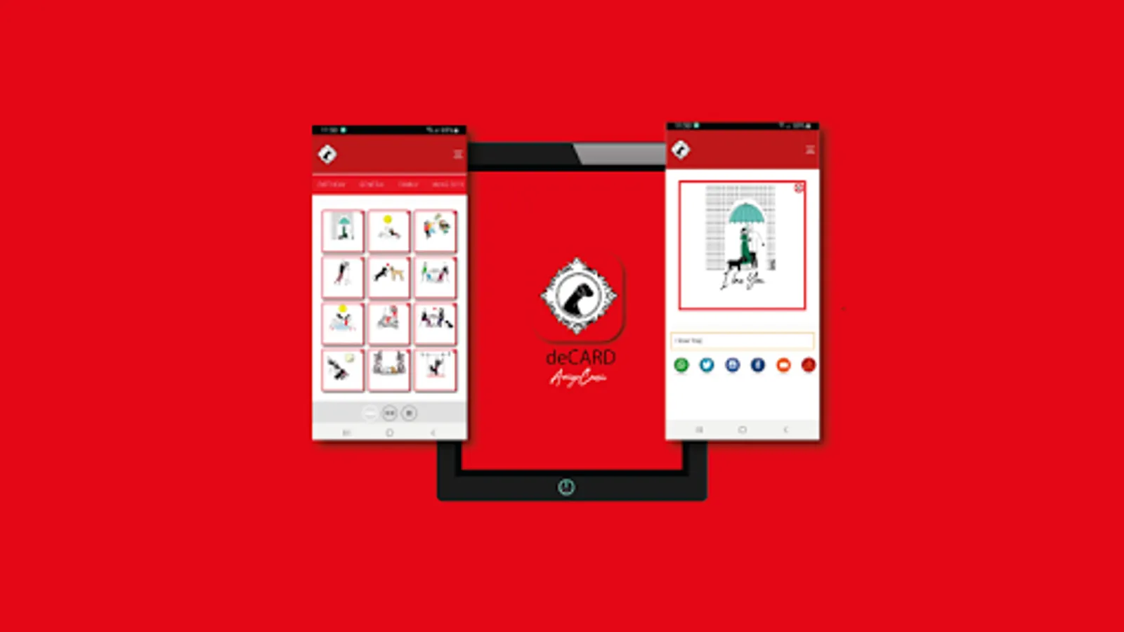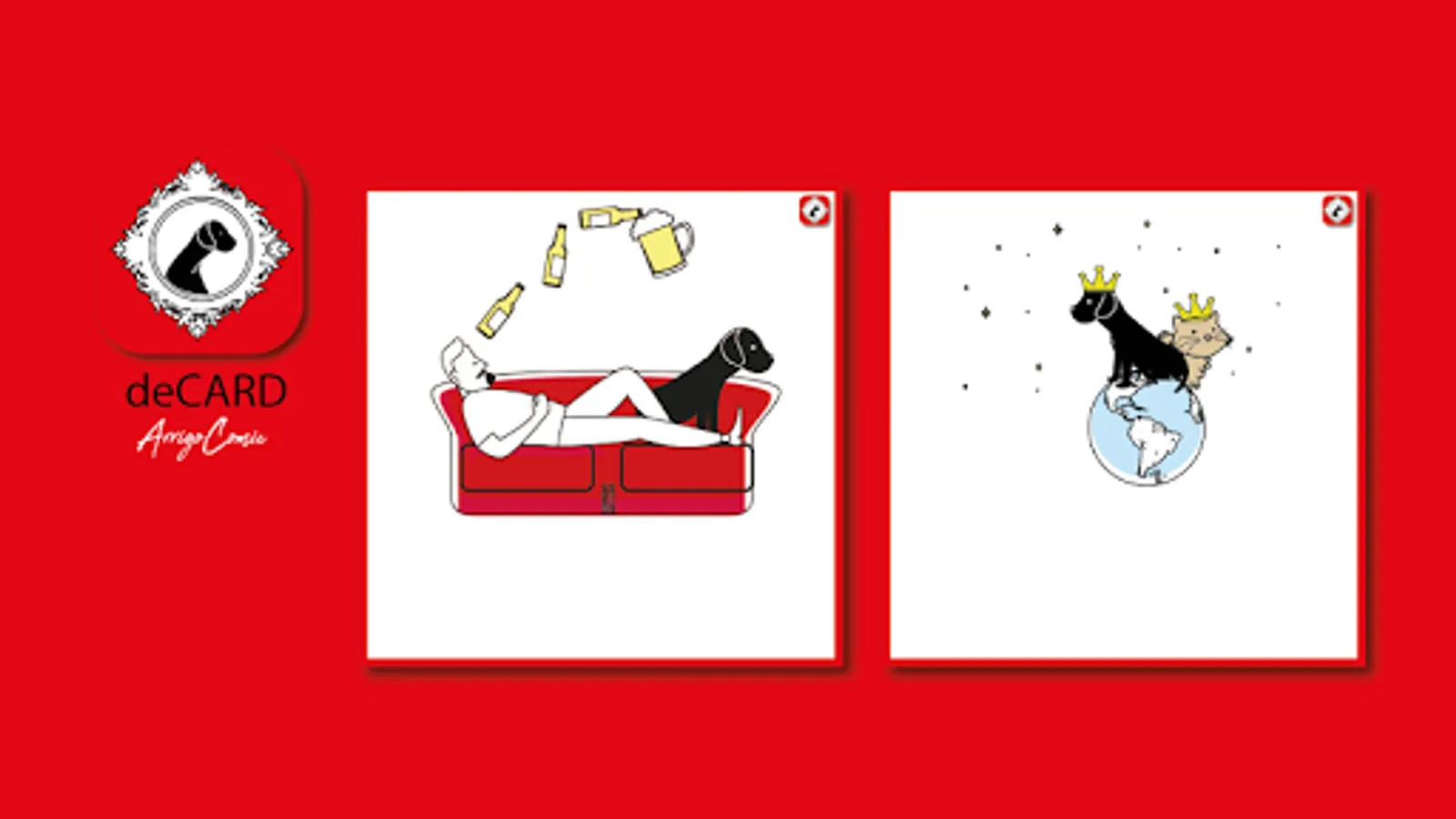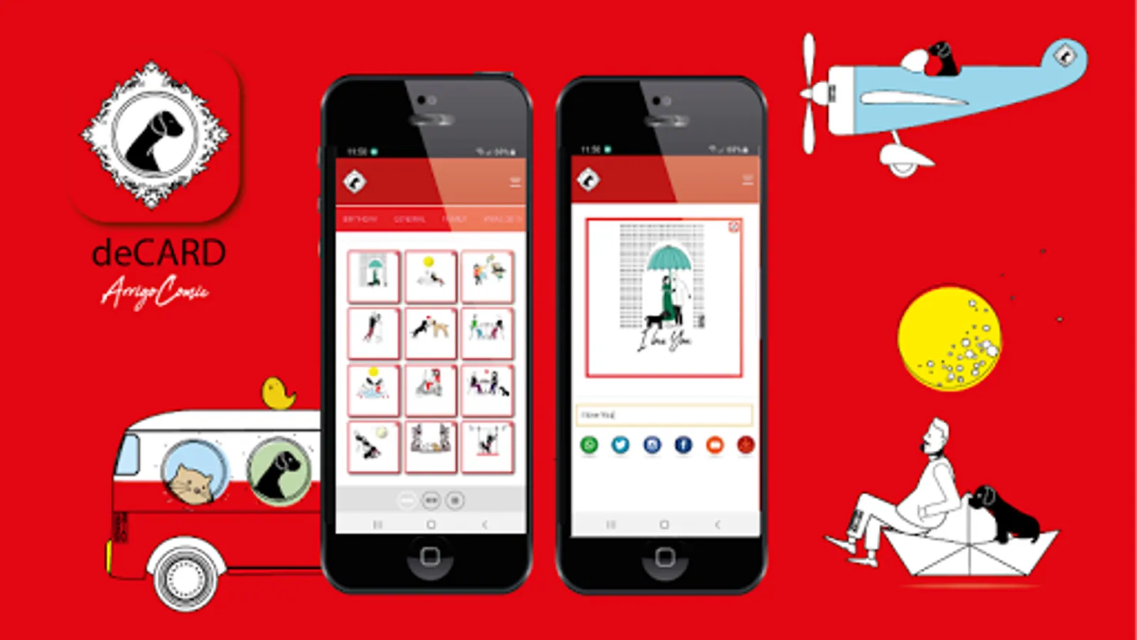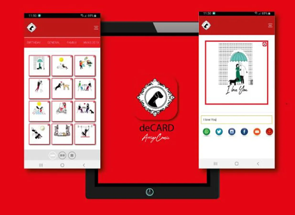 deCard app is an application for communicating your own thoughts, wishing you a birthday or a holiday using the illustrations by Alessandro Arrigo - ArrigoArtwork. You can choose from thematic packages: love, family, fun, friendship, Christmas and more. You will have a basic package of some free images and you will be able to buy the themes you want later without any subscription. Choose the image you prefer from those available, write the message and share easily and directly on whatsapp, facebook, instagram, twitter, email. Say it with deCard app!