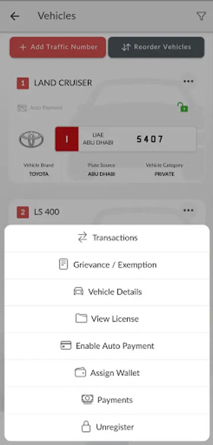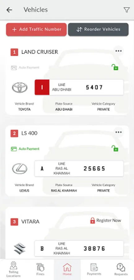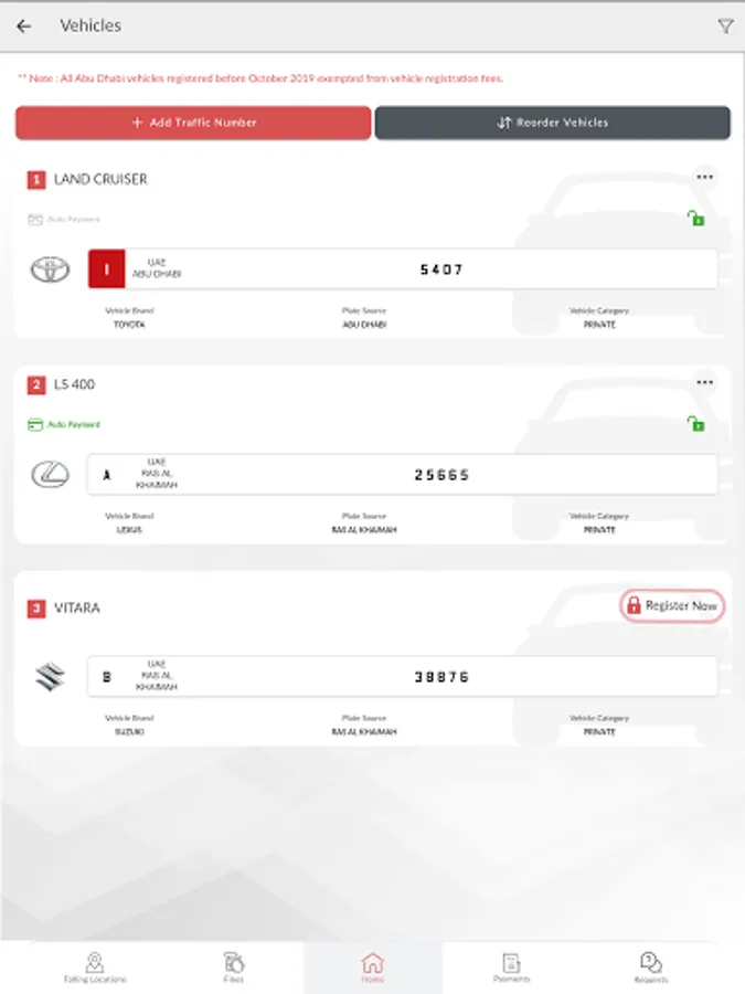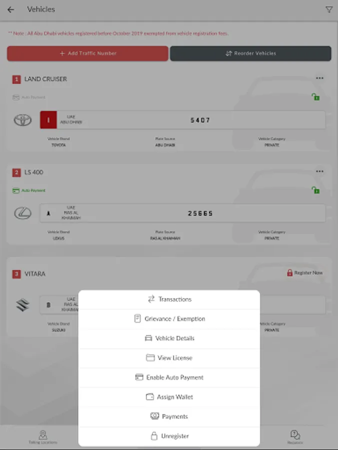 - خدمة تسجيل مركبات المستخدم في النظام من خلال قائمة مركباته المعرفة في الملف المروري الخاص به.