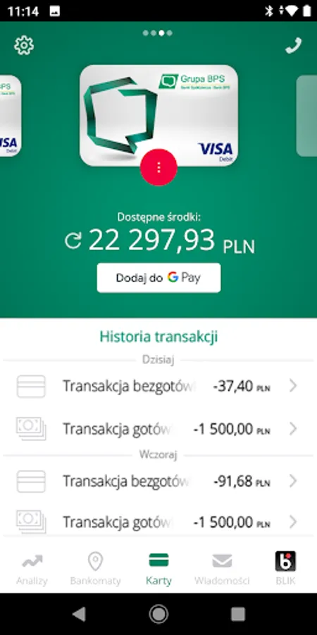 4. Select the Add to GPay button below the image of the card you want to add to mobile payments. At the stage of adding a card for mobile payments, accept the Regulations for using cards of Bank Polskiej Spółdzielczości S.A. as part of Google Pay, as well as formal consents and terms of use of the service presented when adding a card to Google Pay.