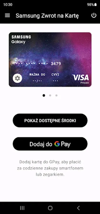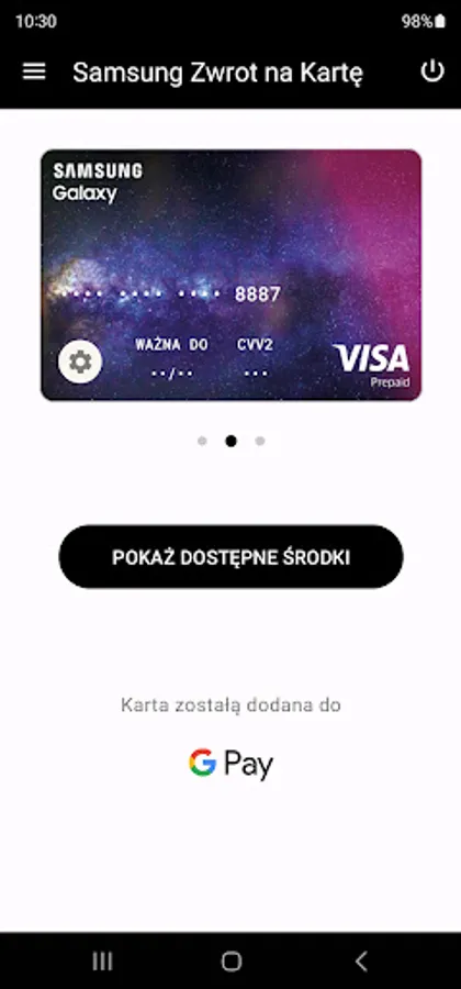 The Samsung Return to Card application is an application thanks to which you can pick up a virtual prepaid card.