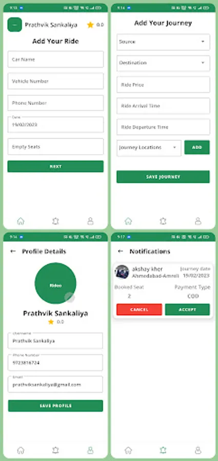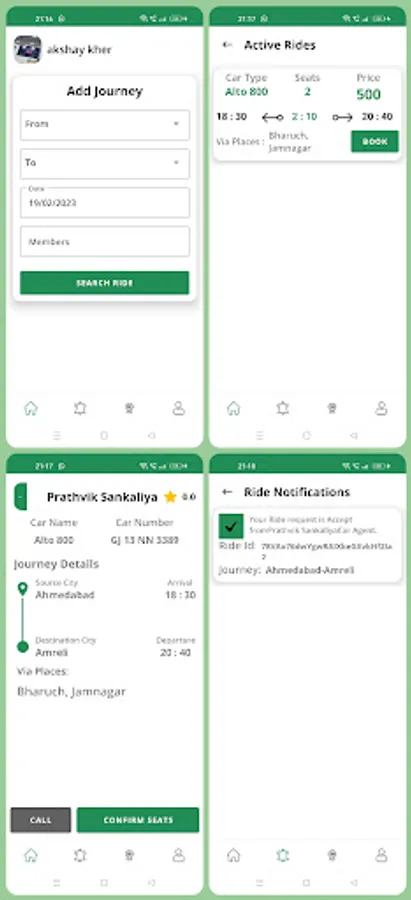 2. **Trip Creation**: Users can create a new trip by specifying their start and end points, departure time, and the number of available seats. They can also add multiple waypoints to the trip, such as on a trip from Ahmedabad to Vadodara through Nadiad and Anand.