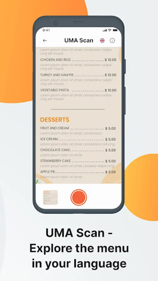 With built-in UMA Scan tool, it's effortless to read menus in any language. Simply select UMA Scan, choose your preferred language for translation, and effortlessly capture the menu using your device's camera. UMA Scan will work its magic, providing you with an instant translation of the menu items.Conquer language barriers with ease and embrace the joy of understanding menus in your own language. UMA Scan makes dining out an easy and engaging experience for everyone.