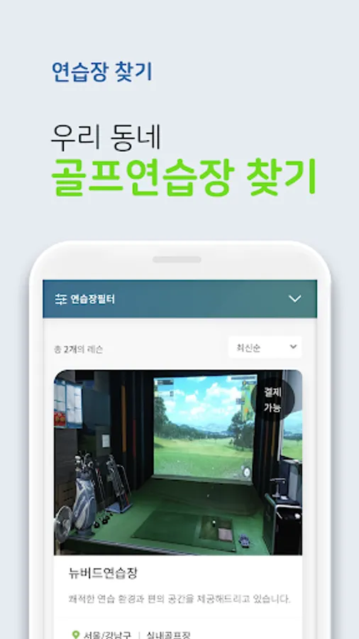 ㆍ내가 원하는 지역의 골프연습장을 다양한 조건을 이용하여 쉽게 찾을 수 있습니다.