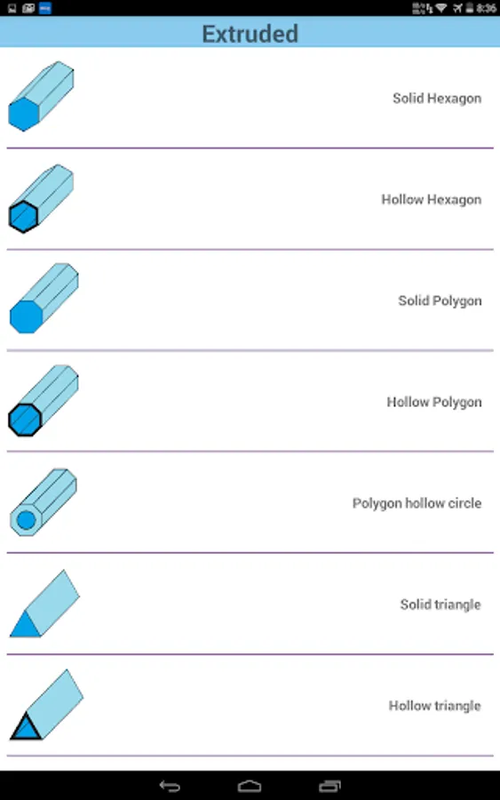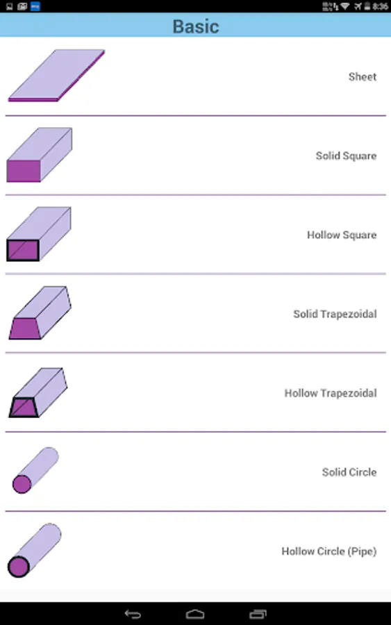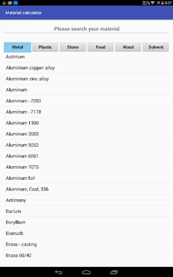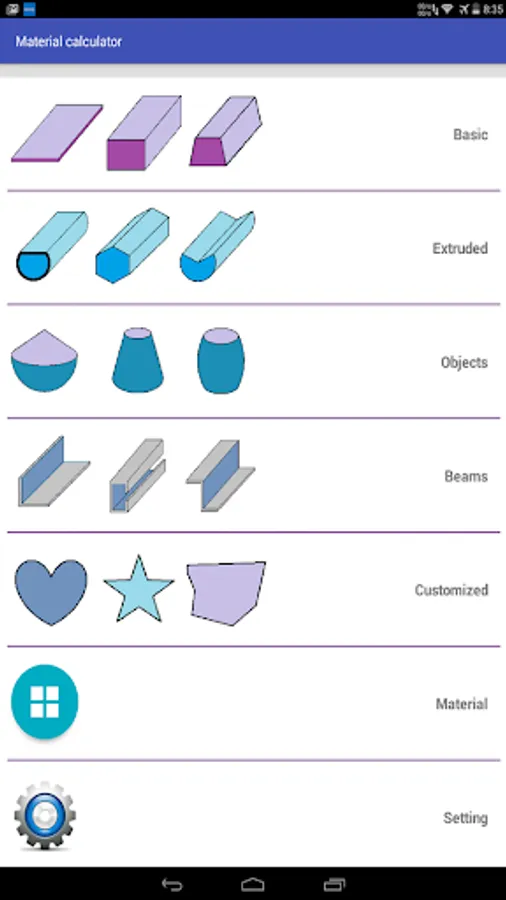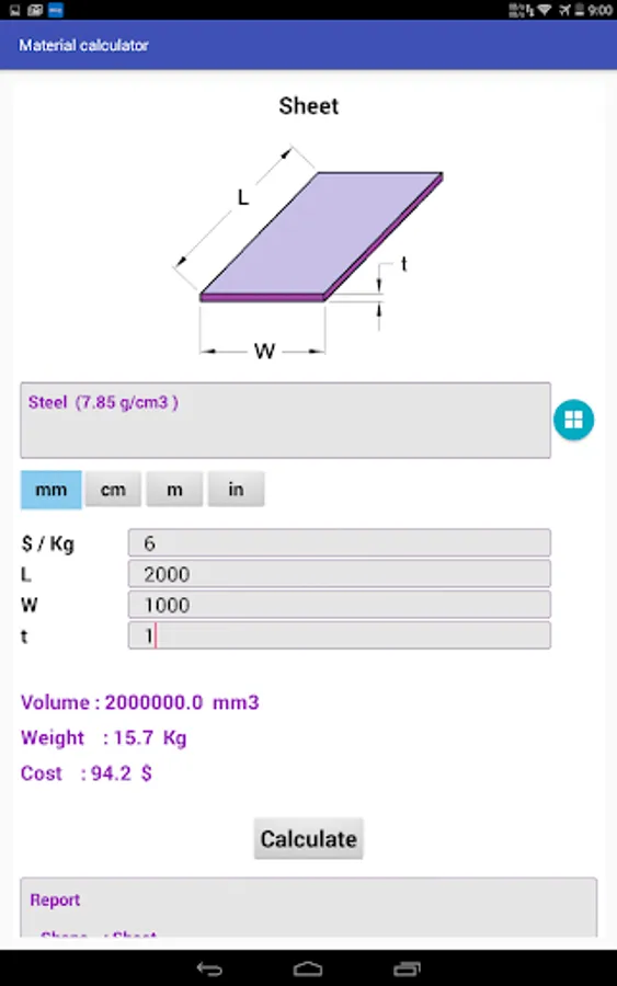 This app is a great app for checking the density of around 400 materials , these materials are listed and categorized , beside the material density you have many geometrical shapes and can get the volume , weight and area , generally you can find in the material calculator app the following features :-