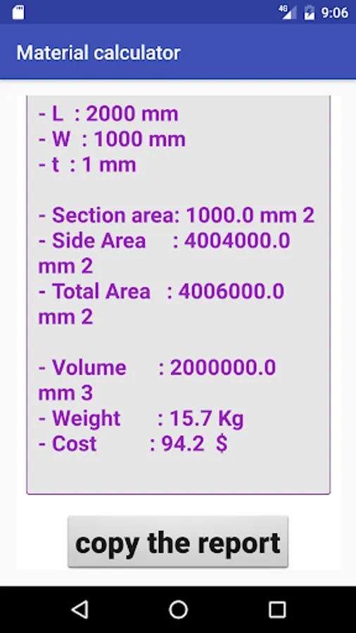 6. It has a report include a lot of information such as surface area , volume , weight , cost , shape and dimensions .