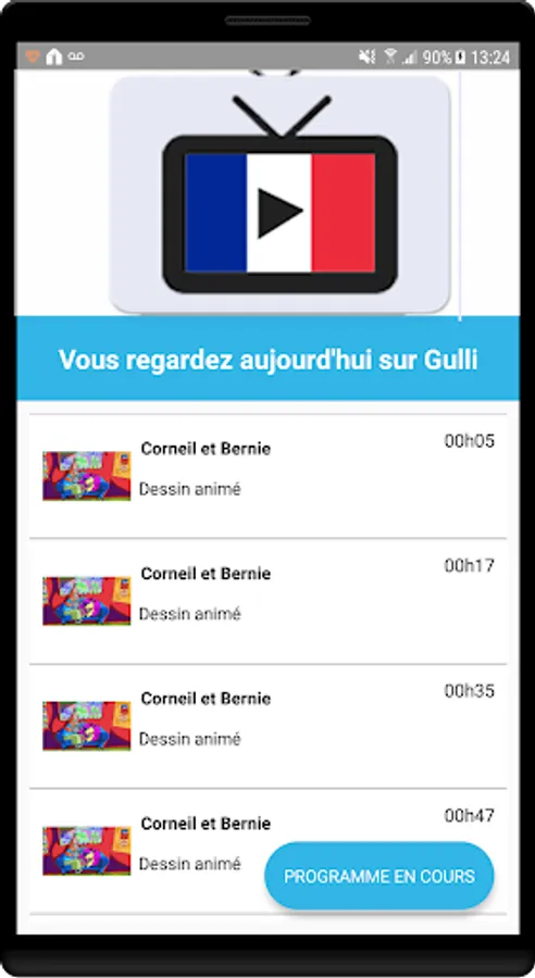 A screen that lists the channels with the current programs. You only have to touch a channel to view the programs.