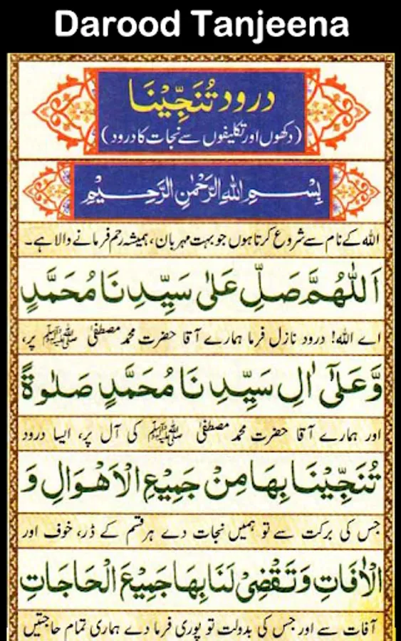 The recitation of darood e tanjeena with urdu translation is a cure for any sickness and protection against all forms of calmities and misfortunes. Darood e taj audio is also the best and quick solution for any kind of problems one can face in life. It provides solution for any kind of domestic and spiritual problems as well as for the sake of getting up rise in the spiritual powers and comfort in life.