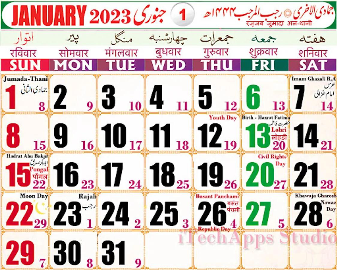 Urdu calendar 2023 Islamic is consisting of 12 months in a year of 356 days which is used mostly in Muslim countries and west regions where Muslims have been living to celebrate Islamic festivals, Offer Hajj, Observe the fasting in Ramdan and other Islamic events in different months of hijri calendar 2023 in year.
