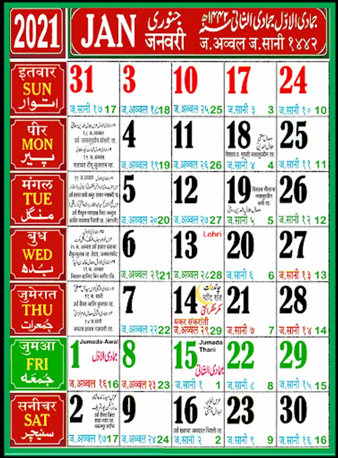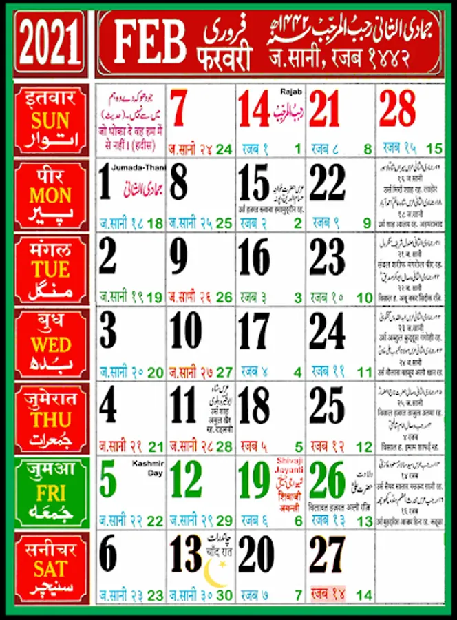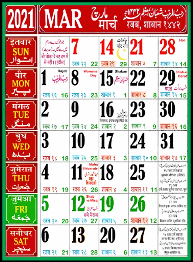 Urdu calendar 2021 is very useful app for our Islamic and Muslim community to determine the proper days of all islamic months 2021. It contain all islamic months with specific information. It also have following months: