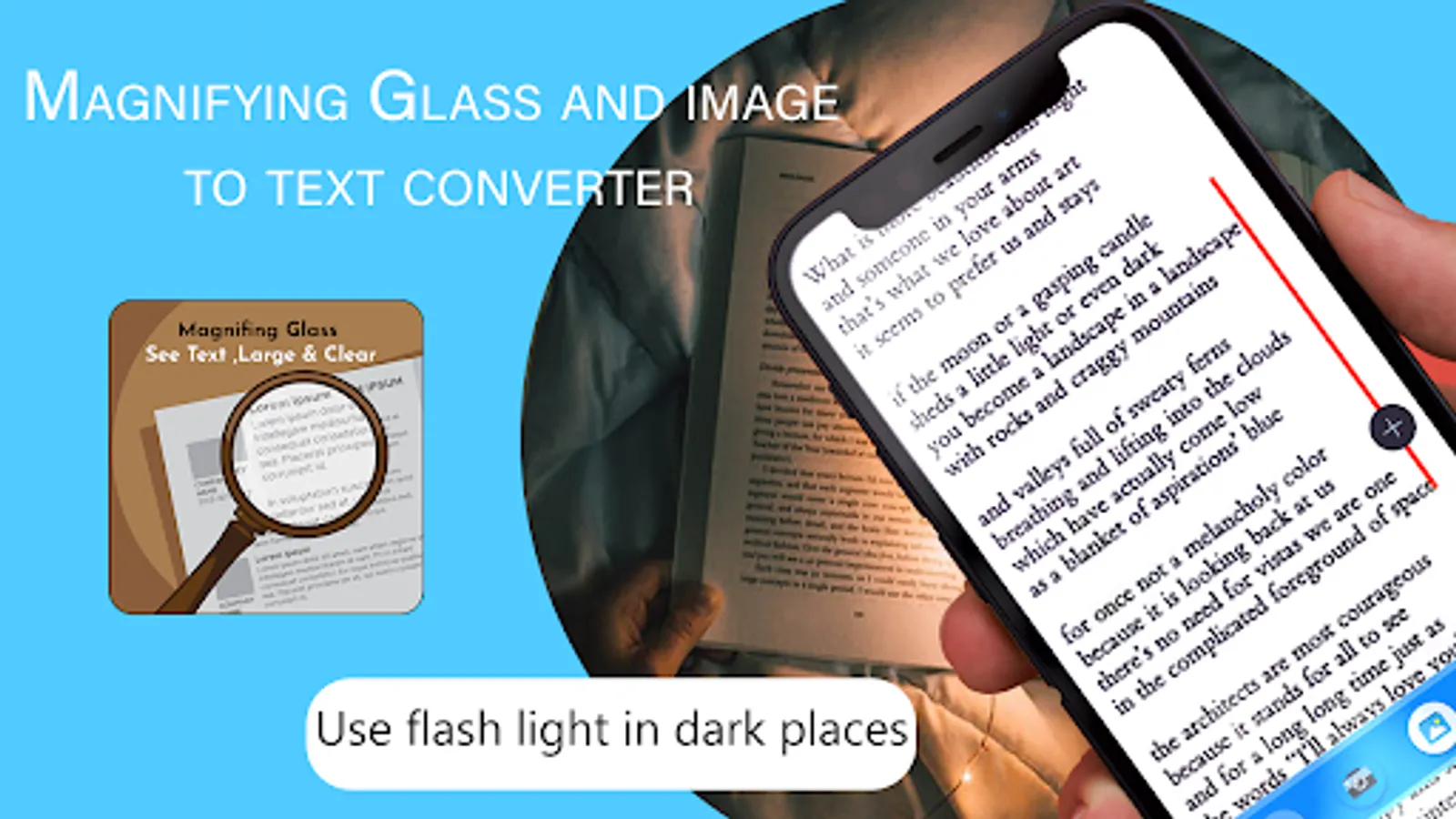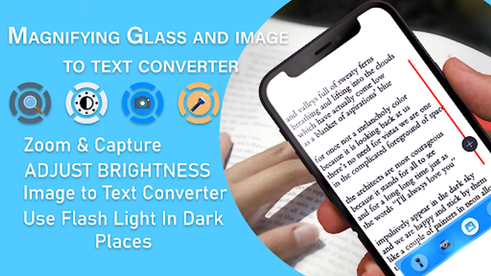 With AI technology, camera of application will focus the text on photo, book, newspaper, magazine. You can zoom it 2X, 4X, 6X or 10X. Magnifying is simplest