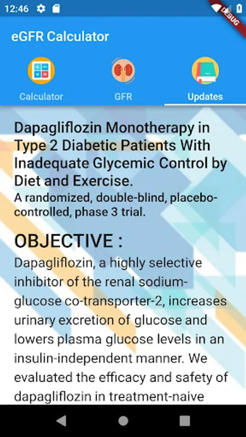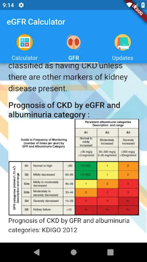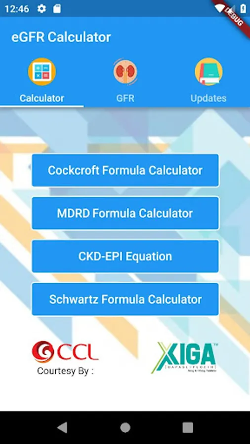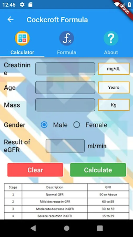 This application allows medical professionals to estimate kidney function using four separate eGFR calculators: