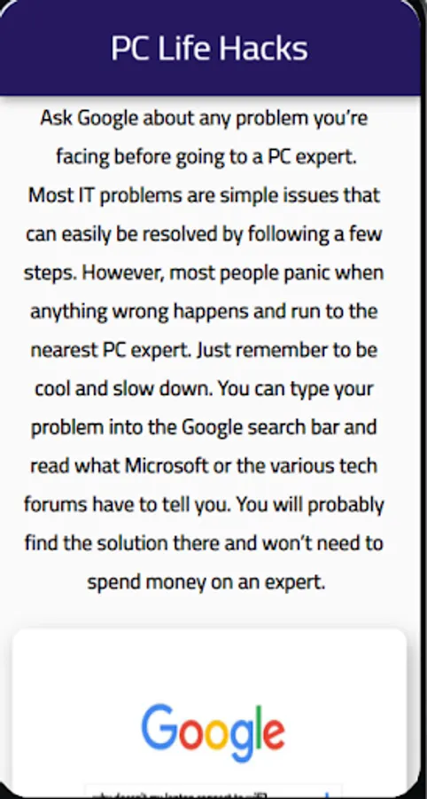 Life Hacks -Cell Phones And PCs Edition- is an app that has some cool life hacks for your mobile phone and your pc