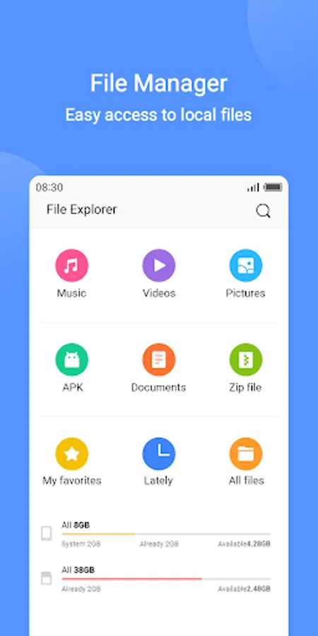 All files are no longer hidden in the mobile system. File manager will help you find file, categorize file easily. It also supports tons of cool features: global search, moving, deleting, opening, and sharing files, as well as renaming, unzipping, and copy-paste.