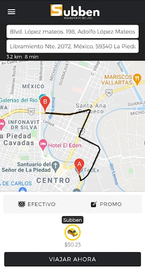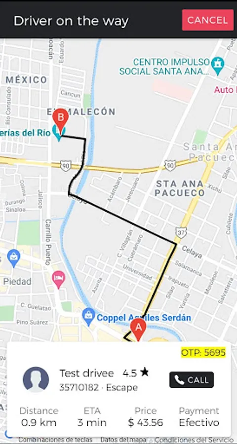 Durante el recorrido tendrás la opción de “Llama de emergencia SOS” en el interfaz de la aplicación, además de poder visualizar la distancia de tu viaje, el tiempo estimado, el precio y el método de pago que elegiste (efectivo o tarjeta).