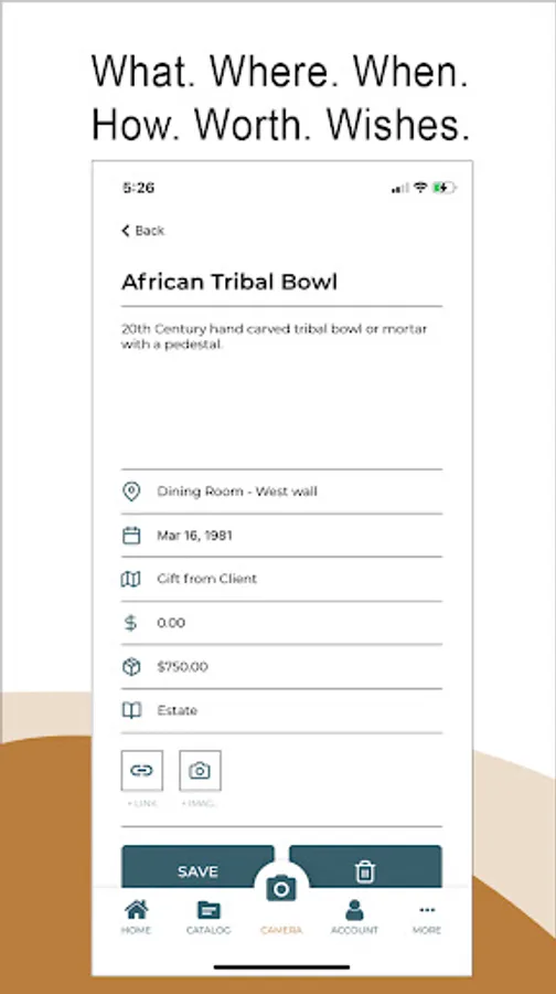 All you have to do is tag each item in the photo with a description (backstory) and other pertinent info like the location of item, price paid, place acquired, today’s value, a link to similar items found on the net, disposition at death, and upload support photos such as artist’s signature, serial and item numbers, and appraisals.