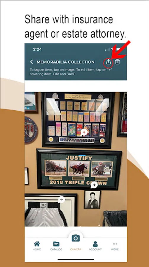 ItemEyes allows you to tag and document items that you consider to be “highly valuable” not only with individual photographs, but by taking a photo of an entire wall and simply tagging items in that photo. Upload close up images of serial numbers, item numbers, and artist’s signatures. Take a snapshot of a wall and tag it all—much quicker. Similar to tagging friends on social media.