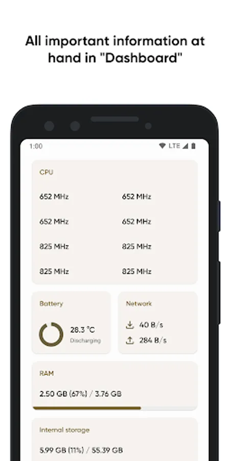 If you are not interested in too detailed information in a larger volume, you can always use the "Dashboard" window, which collects all the most important information - CPU usage, battery status, network usage, and memory load on the device.