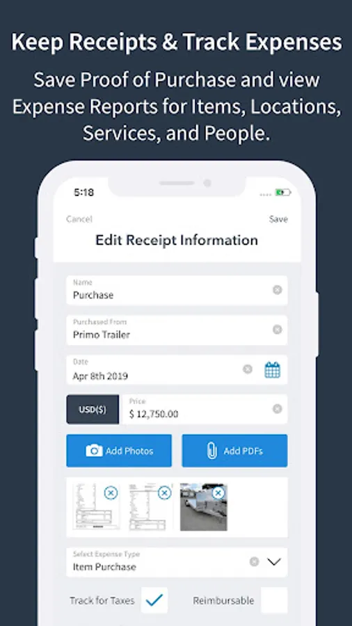 We do more than just catalog everything you own. Snap a photo of the proof of purchase in seconds, attach PDF receipts or add more detailed information such as price, purchase location and currency, and even categorize receipts by the expense type for reporting or exporting to a spreadsheet.