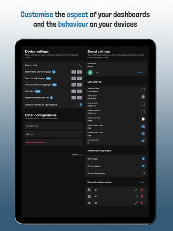 - You can fully customise the aspect of your dashboards and the behaviour on your devices.