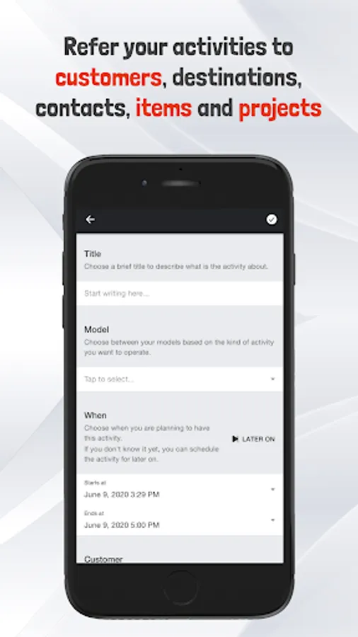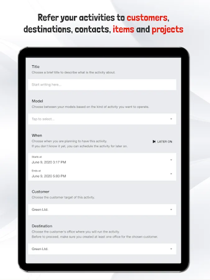- Refer your activities to customers, destinations, contacts, items and projects and link all of them together.