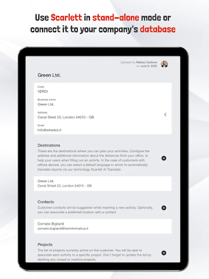 Scarlett offers API interfaces to sync data with external sources, like ERPs and other software. By integrating it inside the company processes, it allows you to obtain the best out of the platform.