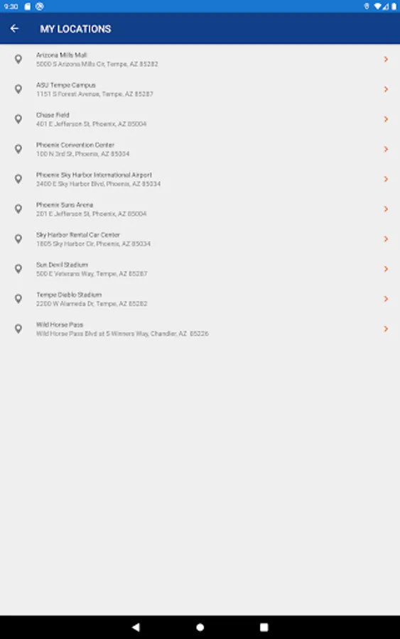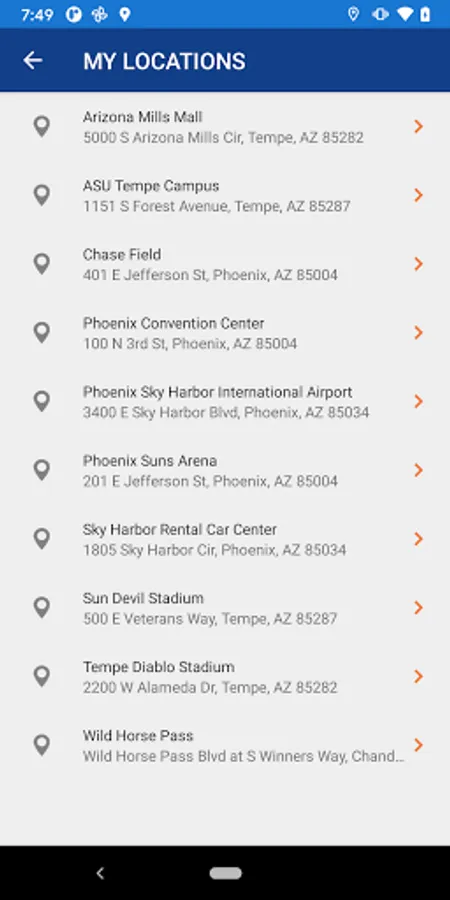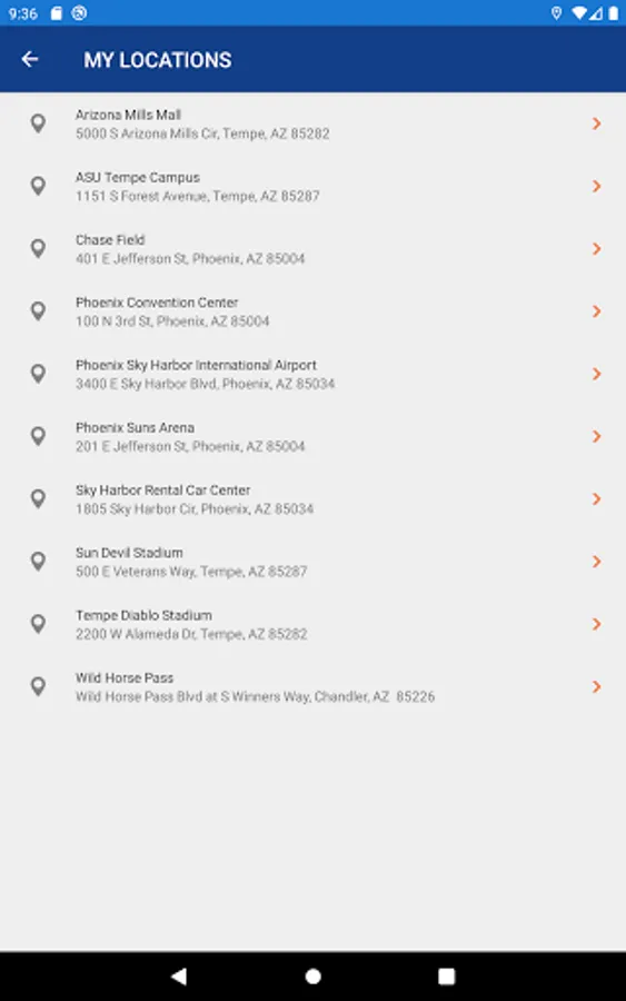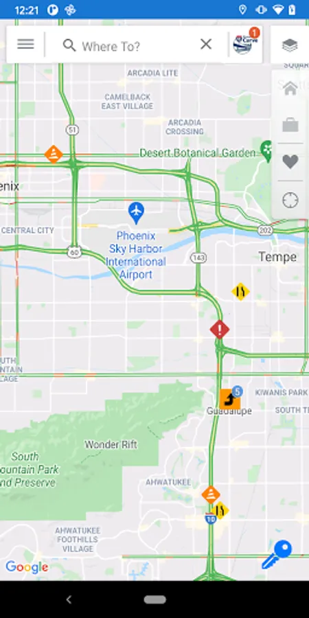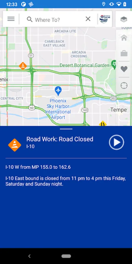 Travel times to popular locations near the construction area including Phoenix Sky Harbor International Airport, Phoenix Sky Harbor Rental Car Center, Phoenix Convention Center, Phoenix Suns Arena, Chase Field, Arizona State University and Sun Devil Stadium, and Tempe Diablo Stadium