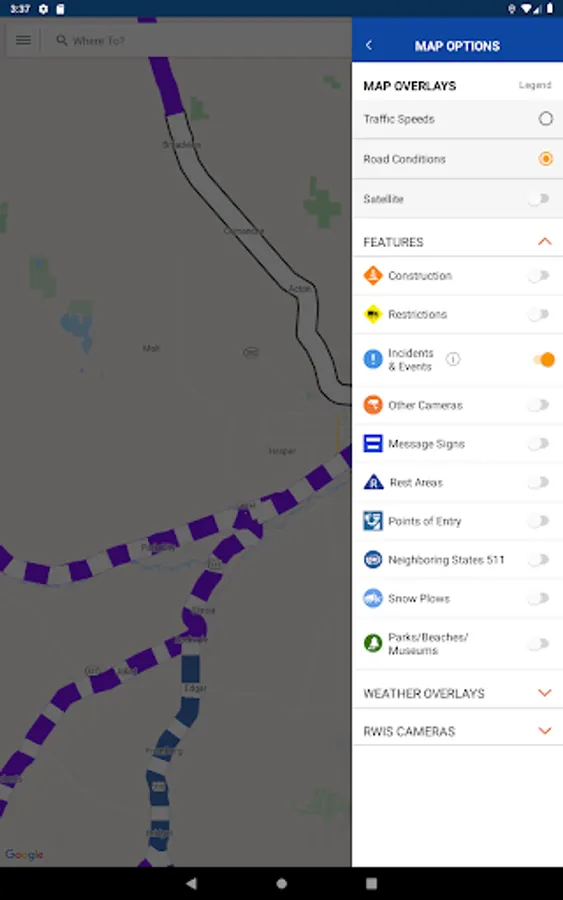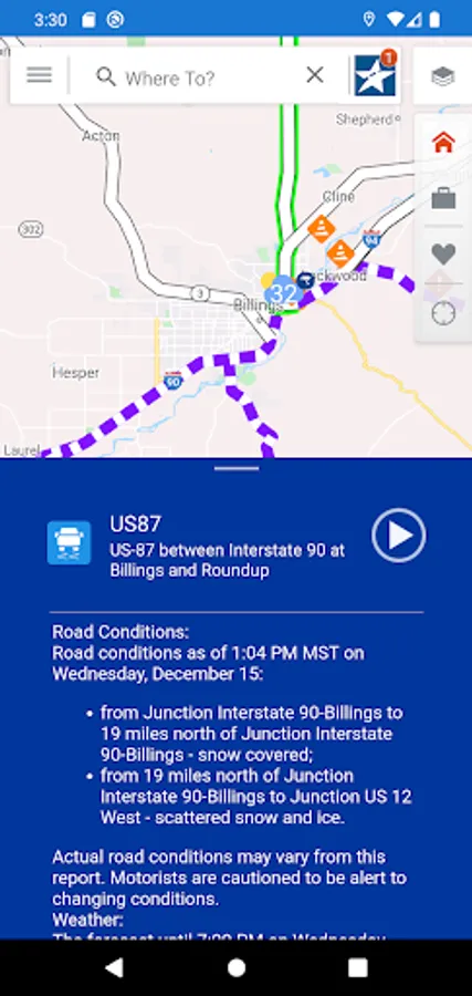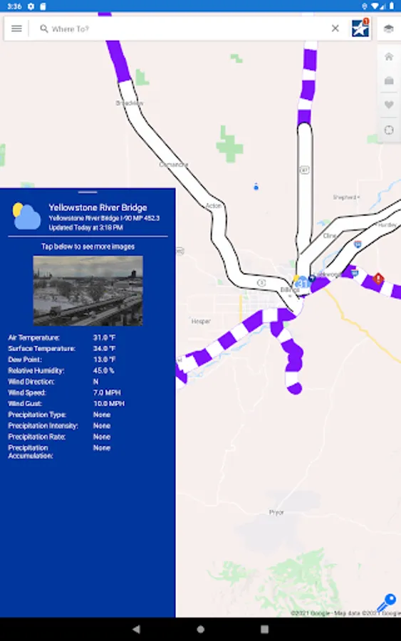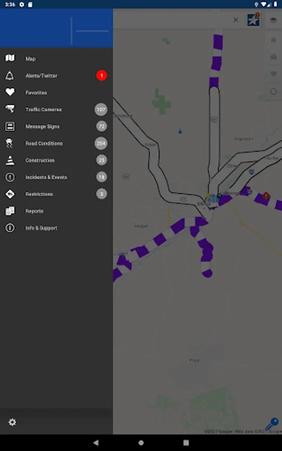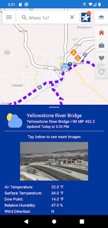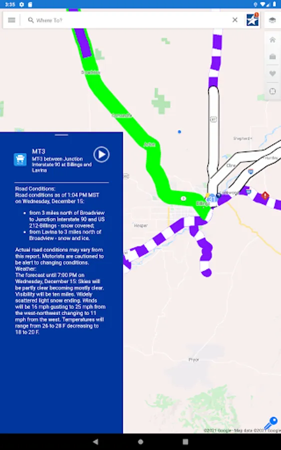 The MDT 511 mobile application provides real-time access to traveler information supplied by the Montana Department of Transportation (MDT). Maps depict current roadway conditions and the latest incident, construction, and restriction information on all Interstate, U.S., and State Routes. Forecasted road condition threats for the upcoming 24 hours are described in the road segment reports, and where there are such threats may be viewed on the map. The maps also indicate the location of roadside cameras and allow the user to view camera images. As the user moves through the highway network, the app keeps track of the user’s location on the map. MDT also maintains a Twitter feed accessible through the 511 mobile application's main menu. Finally, the mobile application links surrounding states' mobile applications and mobile websites.