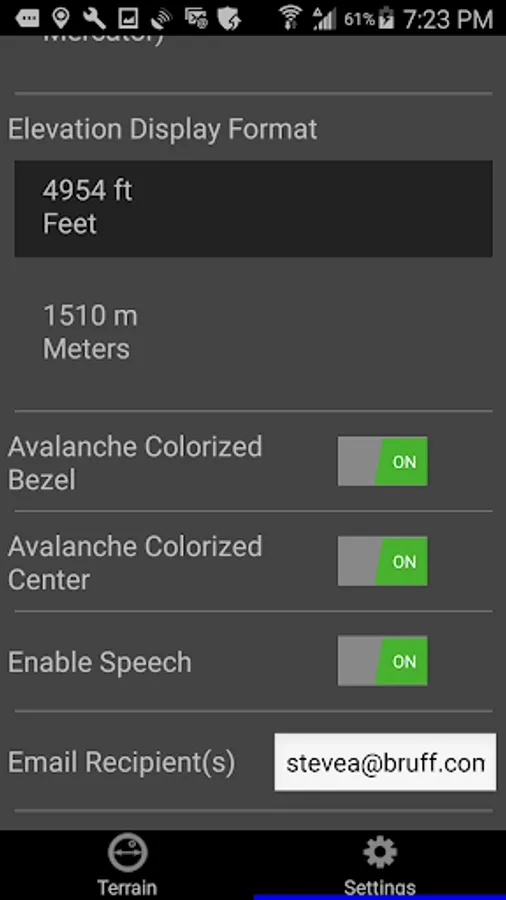 After measuring the slope, you can tap a single button to share your current GPS location, the slope in degrees, and the elevation. The email includes kml and gpx waypoint files, as well as a link that will let you quickly see the location in any browser. You can enter the email address(es) one time on the Settings page and the Avalanche Inclinometer will remember it for next time. Less typing; more skiing.