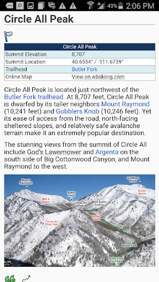 The app also displays your current elevation and lat/long, and will send your current location via email. And beginning with version 3.6.0, you can display detailed information on more than 200 of the locations including skiing difficulty, skinning distance, vertical climb, parking considerations, and more.