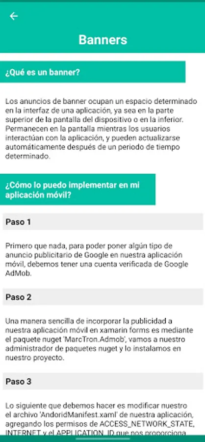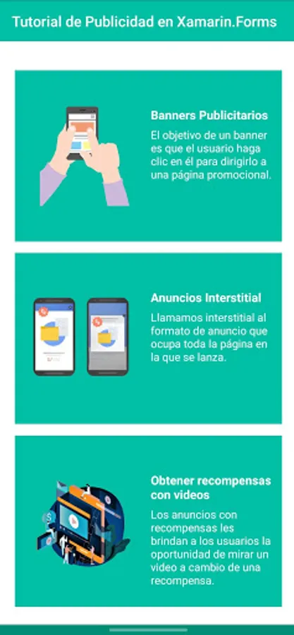 This application contains different tutorials that help developers to know how to incorporate the most used types of advertising such as banners, interstitial ads and rewarded videos, so that our mobile applications developed in xamarin.forms are monetized in a fast, easy and simple.