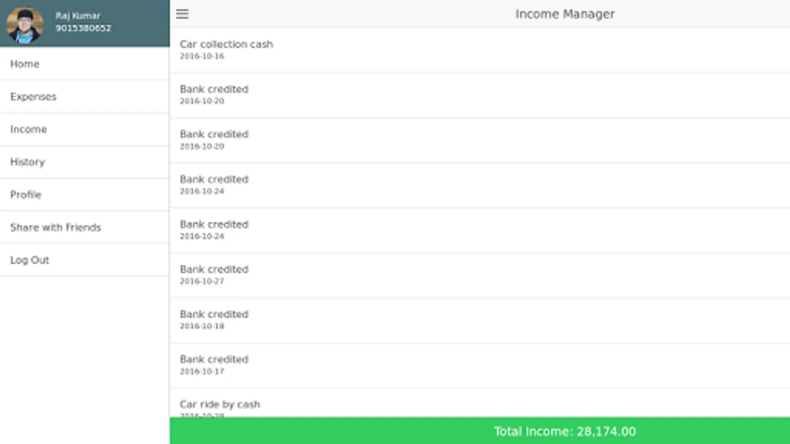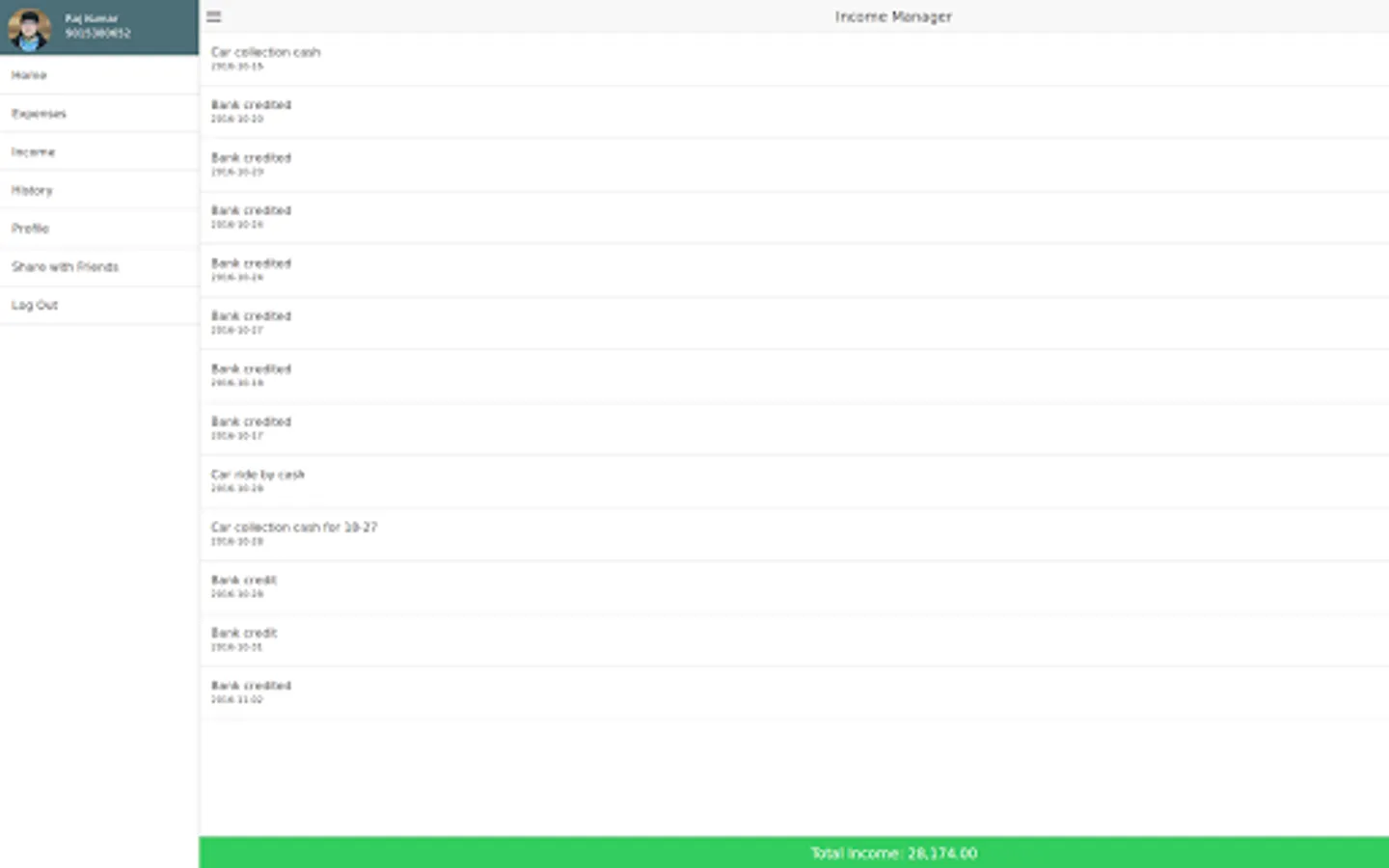 Manage the all income and expense of Ola,uber and Cabs. It's easy to use and maintain the all expense and income, also good filter feature with income and expense.