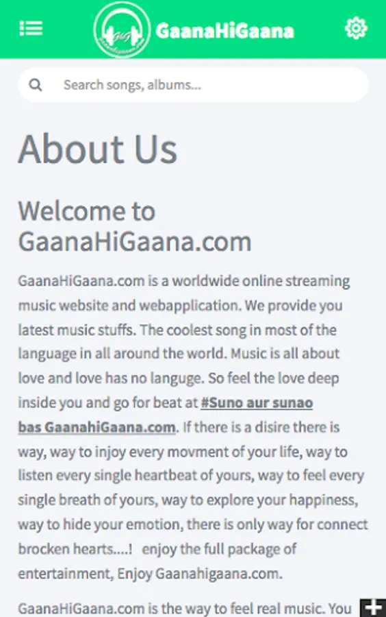 GaanaHiGaana.com is a worldwide online streaming music website and web application. We provide you latest music stuffs. The coolest song in most of the language in all around the world. Music is all about love and love has no language. So feel the love deep inside you and go for beat at #Suno aur sunao bas GaanahiGaana.com. If there is a desire there is way, way to enjoy every moment of your life, way to listen every single heartbeat of yours, way to feel every single breath of yours, way to explore your happiness, way to hide your emotion, there is only way for connect broken hearts....! enjoy the full package of entertainment, Enjoy Gaanahigaana.com.