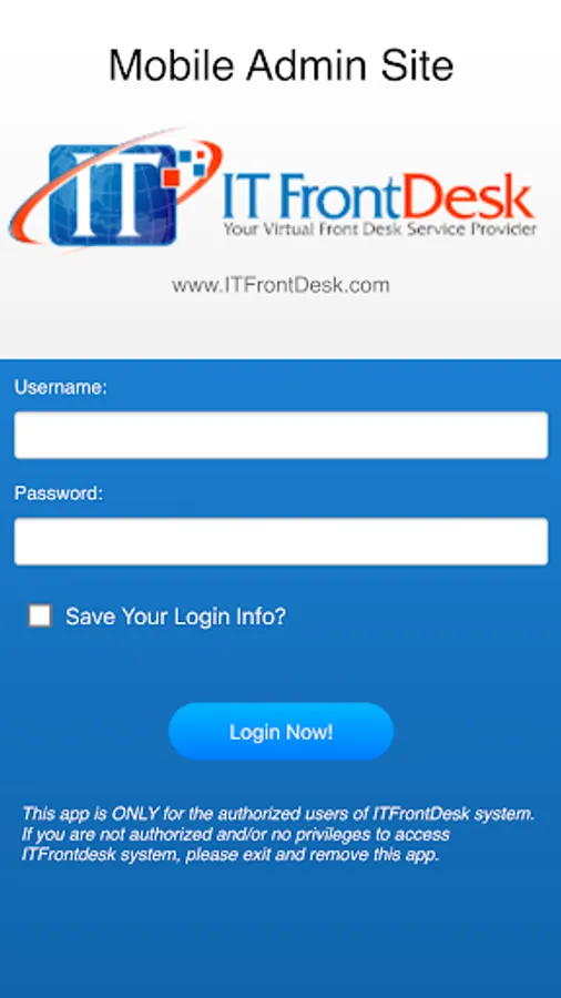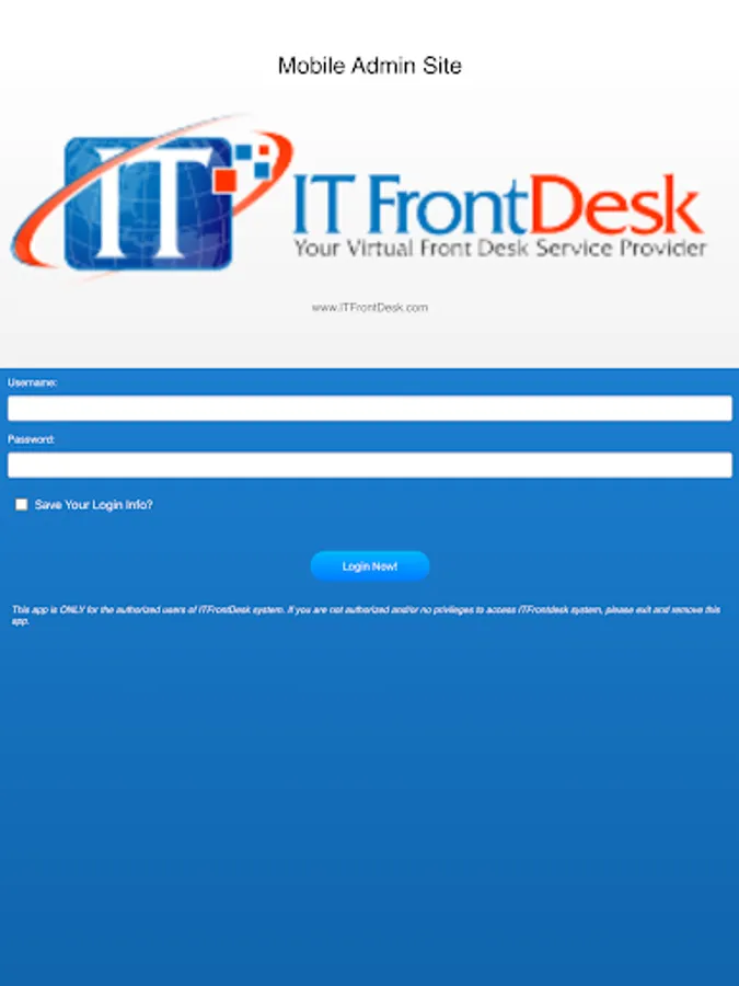This is administrative app for ITFrontDesk clients who use AppointmentDesk cloud based scheduling software. Only authorized users having client logins can access this app.