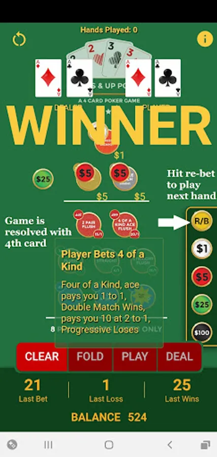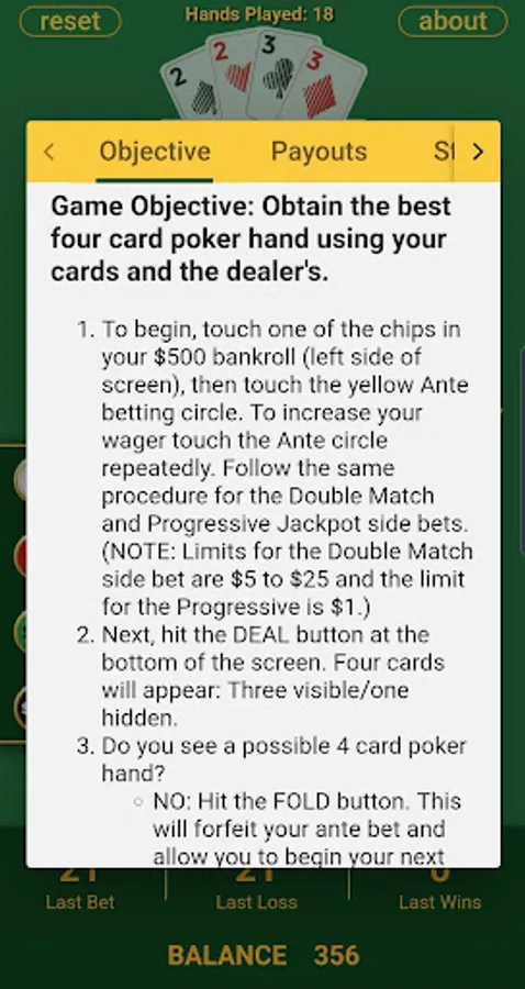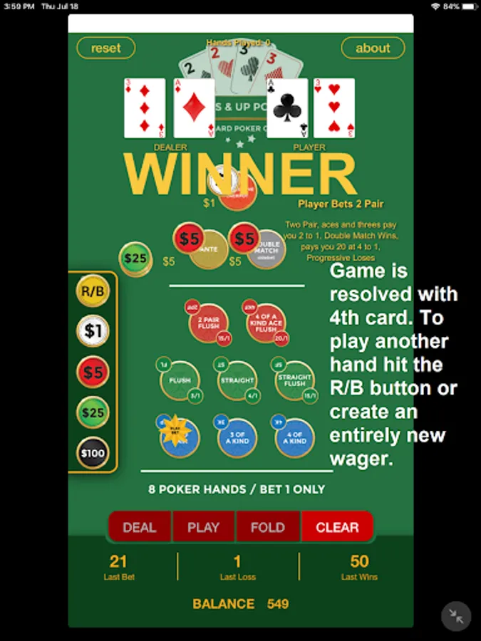 ♠ Completely free game resets to start over or buy more chips.