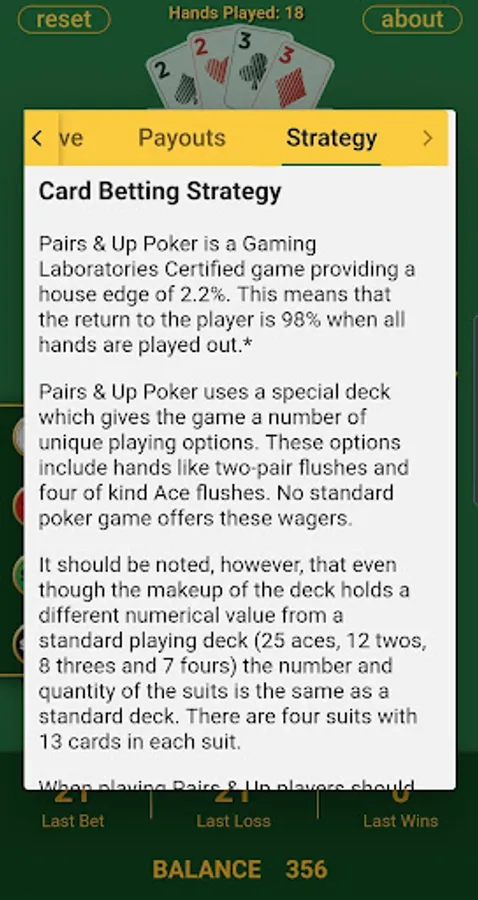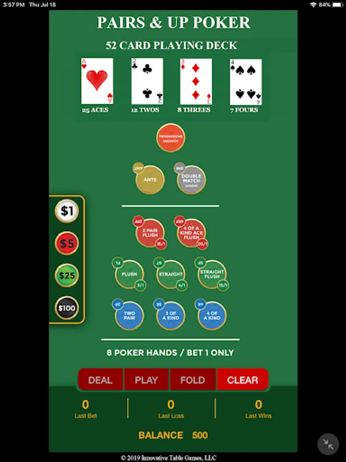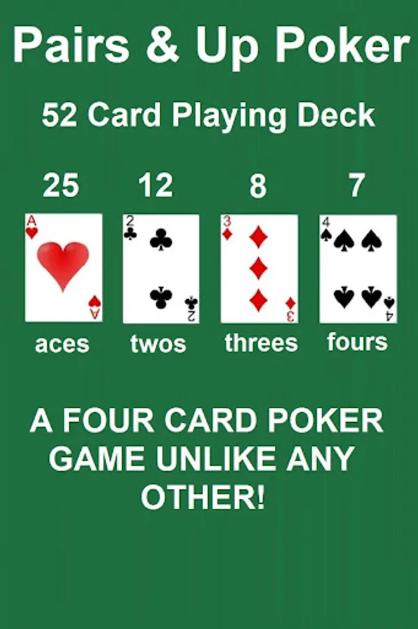 Pairs & Up Poker uses a totally re-imagined deck of playing cards. In our game you play poker with a 52 card deck comprised of 25 aces, 12 twos, 8 threes and 7 fours.