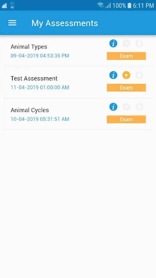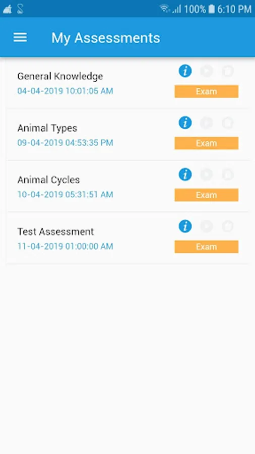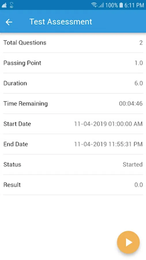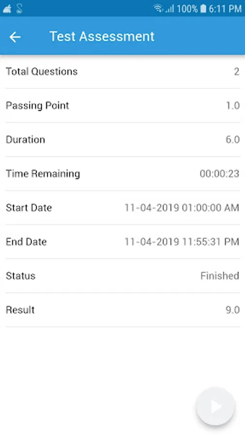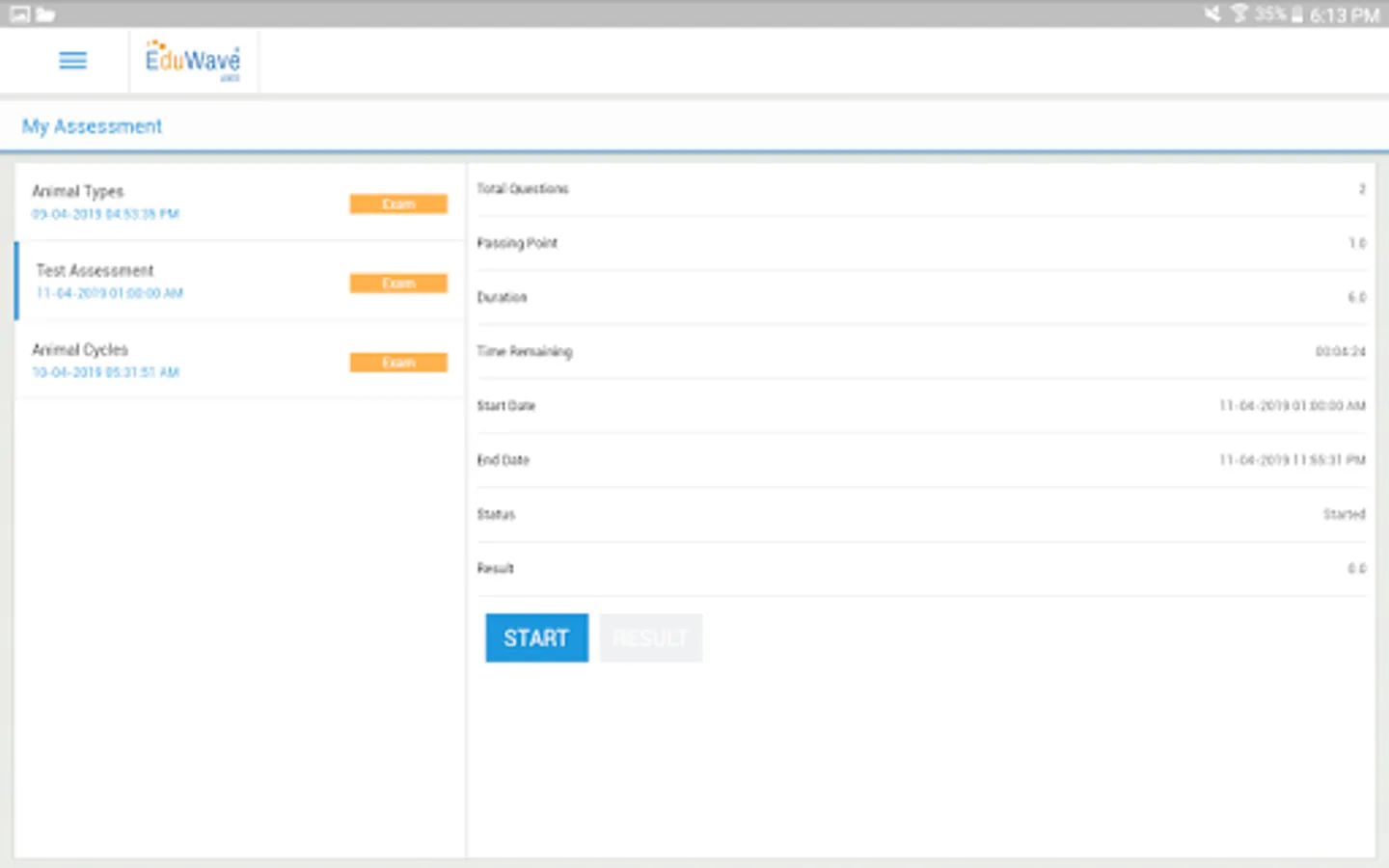 - Access the published assessment that they are registered for, and view related details such as type, number of questions, passing mark, description, duration, remaining time, start and end dates, status, and the result after completing the assessment.