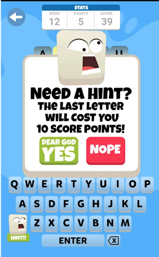 You're allowed 2 hints, but each hit will cost you 10 score points. The first hit gives you the Last letter of the word. The second hit gives you the First letter of the word.
