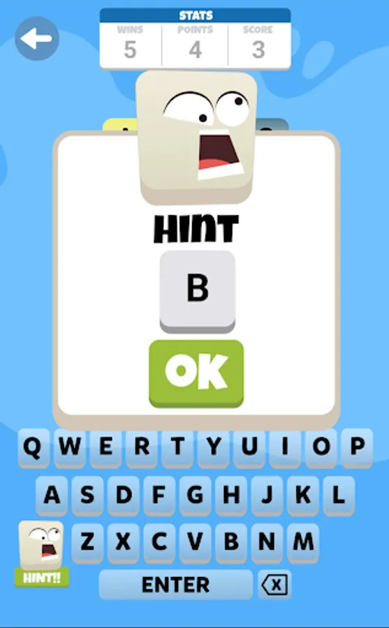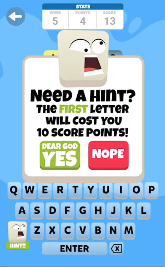 You're allowed 2 hints, but each hit will cost you 10 score points. The first hit gives you the Last letter of the word. The second hit gives you the First letter of the word.