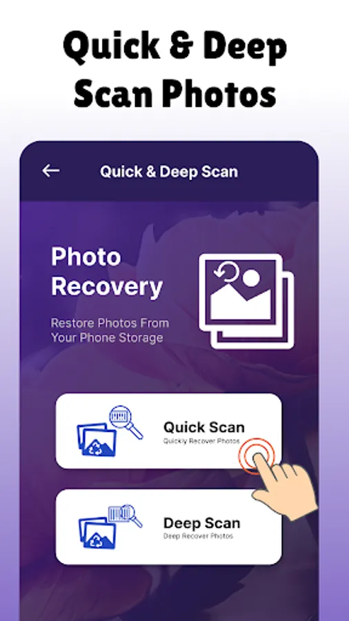 Restore images app is designed with a user-friendly interface and powerful features. Before you restore your photos, you can preview them to ensure that you are recovering the right files. All files can be accessed from one location. You can use the deep scan feature to find hidden files on your phone. Once you have scanned all of the trashed photos, mark all the important lost pictures, then click the recovery button, and all your marked photos will automatically be restored back to your gallery.