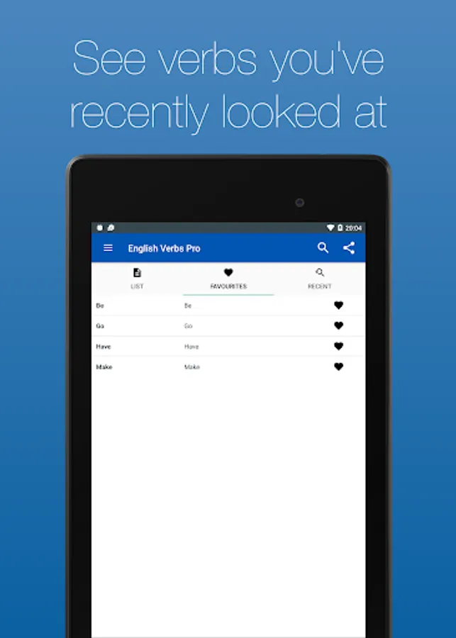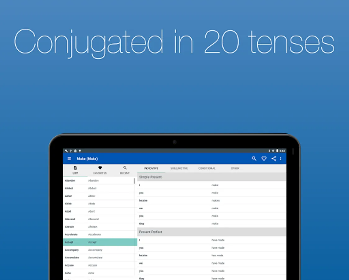 View almost 2000 English verbs in 20 tenses. With simple navigation and built in search, you can find the verb you need in seconds.