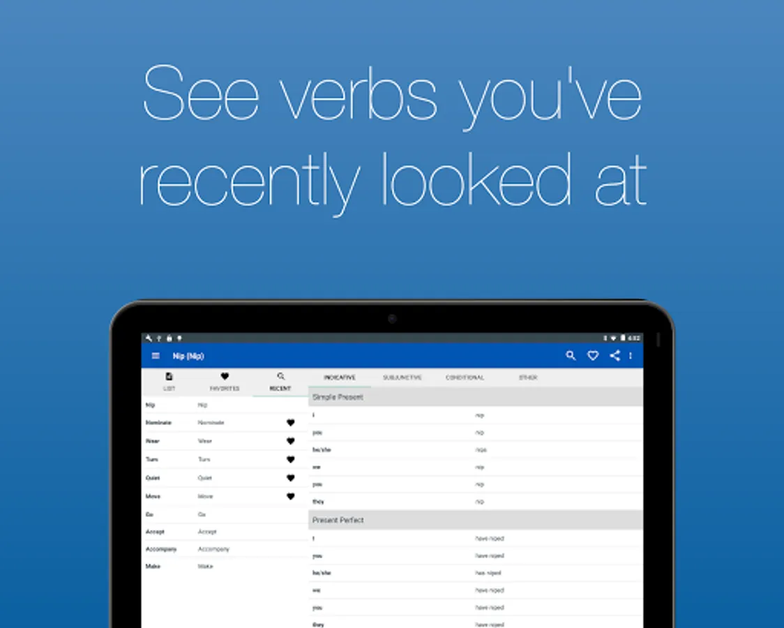 Now with audio!! Not sure how to pronounce a verb? You can now hear how every verb is pronounced. Just tap on the button next to the conjugation. Verbs with audio have a speaker symbol next to them. Note: this functionality requires an Internet connection.