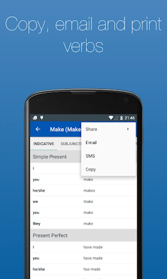 ● Includes the ability to copy, email and SMS verb conjugations.