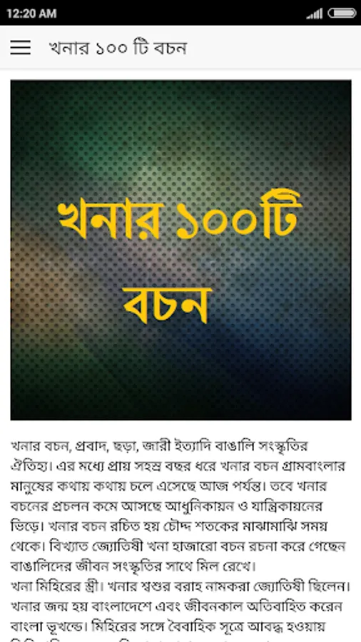 Khanar Bachan is a rhyme based on agriculture. Written between the 8th and 12th centuries. According to many, these rhymes were written by a brilliant Bengali woman named Khana who is an expert in astronomy. However, there are differences. The words of innumerable mines have been associated with the life of the people of rural Bengal for ages. It is rumored that Khanar resided in the village of Deuli in the then Barasat subdivision of the twenty-four parganas. Even King Vikramaditya's meeting is said to be one of the Navaratnas.